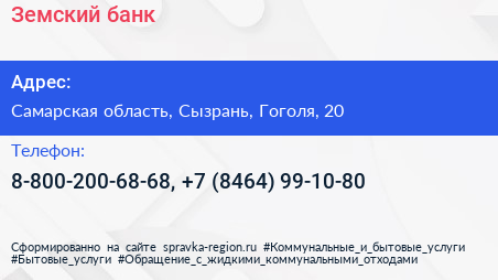 Земский банк по адресу Самарская область, Сызрань, Гоголя, 20 в дальнейшем Организация, размещена в следующих категориях: