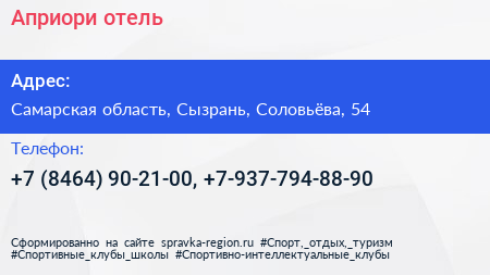 Априори, отель по адресу Самарская область, Сызрань, Соловьёва, 54 в дальнейшем Организация, размещена в следующих категориях: