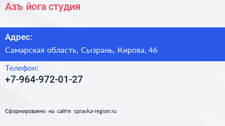 Азъ-йога, студия по адресу Самарская область, Сызрань, Кирова, 46 в дальнейшем Организация, размещена в следующих категориях: