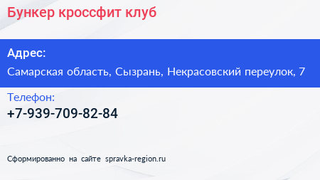 Бункер, кроссфит-клуб по адресу Самарская область, Сызрань, Некрасовский переулок, 7 в дальнейшем Организация, размещена в следующих категориях: