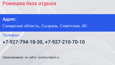 Ромашка, база отдыха по адресу Самарская область, Сызрань, Советская, 60 в дальнейшем Организация, размещена в следующих категориях: