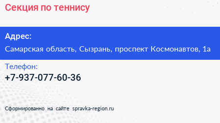 Секция по теннису по адресу Самарская область, Сызрань, проспект Космонавтов, 1а в дальнейшем Организация, размещена в следующих категориях: