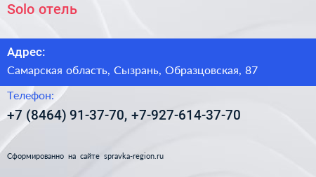 Solo, отель по адресу Самарская область, Сызрань, Образцовская, 87 в дальнейшем Организация, размещена в следующих категориях: