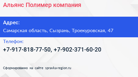 Альянс Полимер, компания по адресу Самарская область, Сызрань, Троекуровская, 47 в дальнейшем Организация, размещена в следующих категориях: