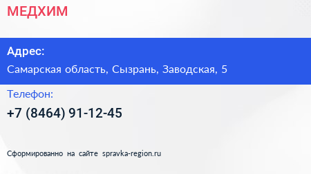 МЕДХИМ по адресу Самарская область, Сызрань, Заводская, 5 в дальнейшем Организация, размещена в следующих категориях: