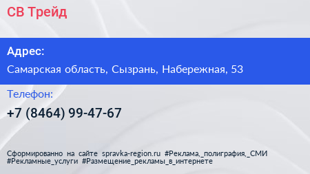 СВ Трейд по адресу Самарская область, Сызрань, Набережная, 53 в дальнейшем Организация, размещена в следующих категориях: