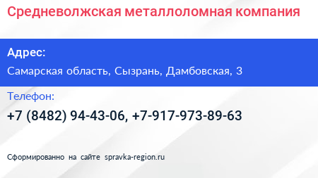 Средневолжская металлоломная компания по адресу Самарская область, Сызрань, Дамбовская, 3 в дальнейшем Организация, размещена в следующих категориях: