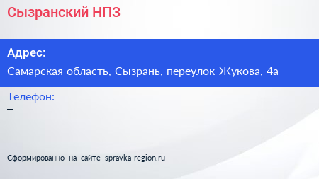 Сызранский НПЗ по адресу Самарская область, Сызрань, переулок Жукова, 4а в дальнейшем Организация, размещена в следующих категориях: