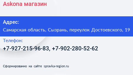 Askona, магазин по адресу Самарская область, Сызрань, переулок Достоевского, 19 в дальнейшем Организация, размещена в следующих категориях: