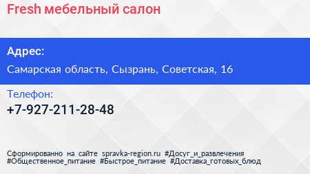 Fresh, мебельный салон по адресу Самарская область, Сызрань, Советская, 16 в дальнейшем Организация, размещена в следующих категориях: