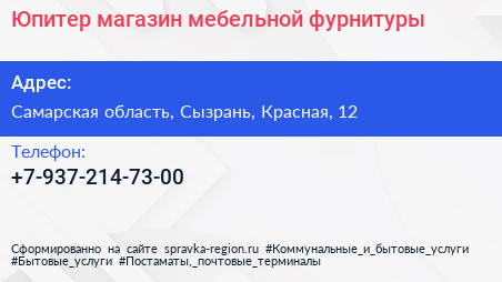 Юпитер, магазин мебельной фурнитуры по адресу Самарская область, Сызрань, Красная, 12 в дальнейшем Организация, размещена в следующих категориях: