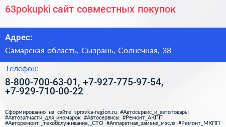 63pokupki, сайт совместных покупок по адресу Самарская область, Сызрань, Солнечная, 38 в дальнейшем Организация, размещена в следующих категориях: