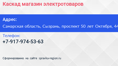 Каскад, магазин электротоваров по адресу Самарская область, Сызрань, проспект 50 лет Октября, 44 в дальнейшем Организация, размещена в следующих категориях: