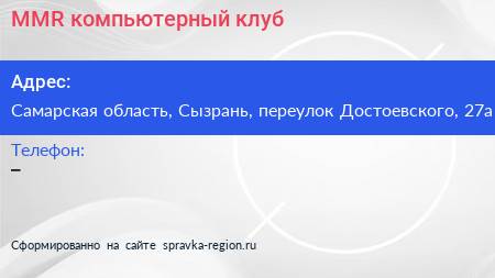 MMR, компьютерный клуб по адресу Самарская область, Сызрань, переулок Достоевского, 27а в дальнейшем Организация, размещена в следующих категориях: