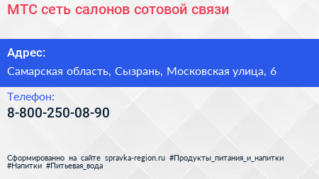 МТС, сеть салонов сотовой связи по адресу Самарская область, Сызрань, Московская улица, 6 в дальнейшем Организация, размещена в следующих категориях: