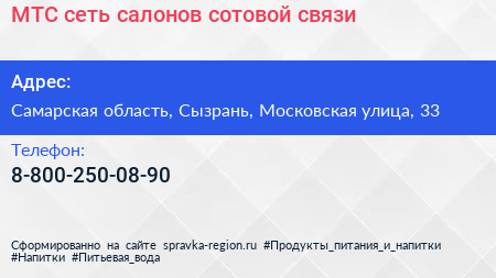 МТС, сеть салонов сотовой связи по адресу Самарская область, Сызрань, Московская улица, 33 в дальнейшем Организация, размещена в следующих категориях:
