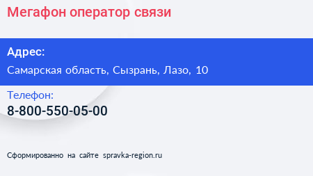 Мегафон, оператор связи по адресу Самарская область, Сызрань, Лазо, 10 в дальнейшем Организация, размещена в следующих категориях: