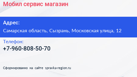 Мобил сервис, магазин по адресу Самарская область, Сызрань, Московская улица, 12 в дальнейшем Организация, размещена в следующих категориях: