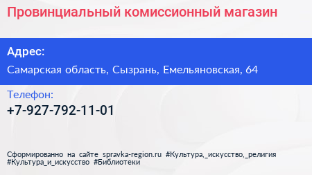 Провинциальный, комиссионный магазин по адресу Самарская область, Сызрань, Емельяновская, 64 в дальнейшем Организация, размещена в следующих категориях: