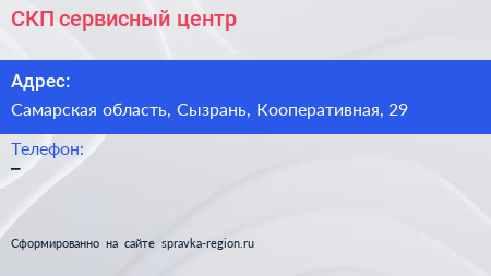 СКП, сервисный центр по адресу Самарская область, Сызрань, Кооперативная, 29 в дальнейшем Организация, размещена в следующих категориях: