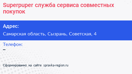 Superpuper, служба сервиса совместных покупок по адресу Самарская область, Сызрань, Советская, 4 в дальнейшем Организация, размещена в следующих категориях: