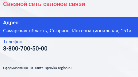 Связной, сеть салонов связи по адресу Самарская область, Сызрань, Интернациональная, 151а в дальнейшем Организация, размещена в следующих категориях:
