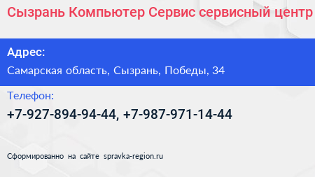 Сызрань Компьютер Сервис, сервисный центр по адресу Самарская область, Сызрань, Победы, 34 в дальнейшем Организация, размещена в следующих категориях: