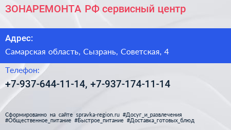 ЗОНАРЕМОНТА.РФ, сервисный центр по адресу Самарская область, Сызрань, Советская, 4 в дальнейшем Организация, размещена в следующих категориях: