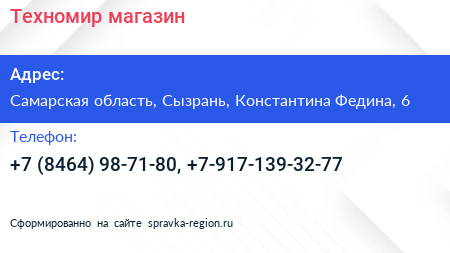 Техномир, магазин по адресу Самарская область, Сызрань, Константина Федина, 6 в дальнейшем Организация, размещена в следующих категориях: