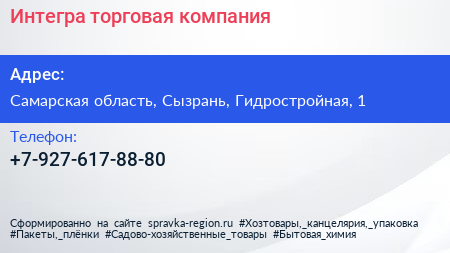 Интегра, торговая компания по адресу Самарская область, Сызрань, Гидростройная, 1 в дальнейшем Организация, размещена в следующих категориях: