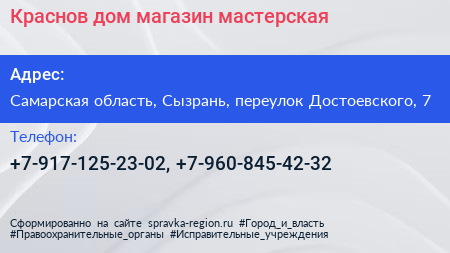 Краснов дом, магазин-мастерская по адресу Самарская область, Сызрань, переулок Достоевского, 7 в дальнейшем Организация, размещена в следующих категориях: