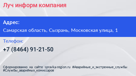 Луч информ, компания по адресу Самарская область, Сызрань, Московская улица, 1 в дальнейшем Организация, размещена в следующих категориях: