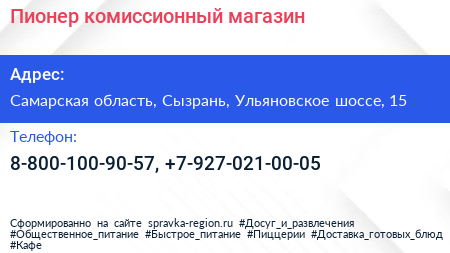 Пионер, комиссионный магазин по адресу Самарская область, Сызрань, Ульяновское шоссе, 15 в дальнейшем Организация, размещена в следующих категориях: