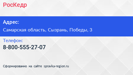 РосКедр по адресу Самарская область, Сызрань, Победы, 3 в дальнейшем Организация, размещена в следующих категориях: