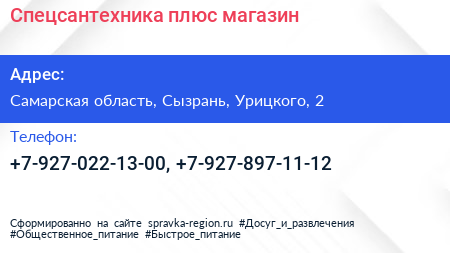Спецсантехника плюс, магазин по адресу Самарская область, Сызрань, Урицкого, 2 в дальнейшем Организация, размещена в следующих категориях: