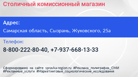 Столичный, комиссионный магазин по адресу Самарская область, Сызрань, Жуковского, 25а в дальнейшем Организация, размещена в следующих категориях: