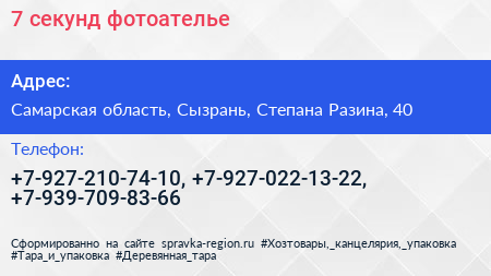 7 секунд, фотоателье по адресу Самарская область, Сызрань, Степана Разина, 40 в дальнейшем Организация, размещена в следующих категориях: