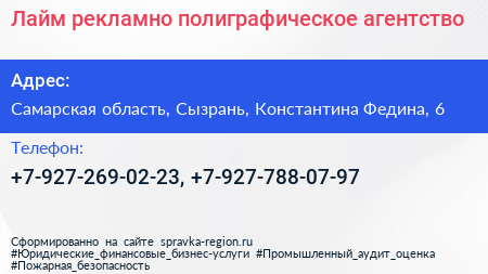 Лайм, рекламно-полиграфическое агентство по адресу Самарская область, Сызрань, Константина Федина, 6 в дальнейшем Организация, размещена в следующих категориях: