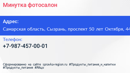 Минутка, фотосалон по адресу Самарская область, Сызрань, проспект 50 лет Октября, 44 в дальнейшем Организация, размещена в следующих категориях: