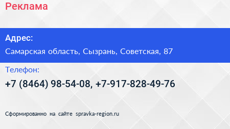 Реклама по адресу Самарская область, Сызрань, Советская, 87 в дальнейшем Организация, размещена в следующих категориях: