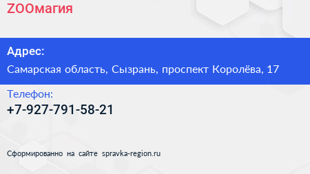 ZOOмагия по адресу Самарская область, Сызрань, проспект Королёва, 17 в дальнейшем Организация, размещена в следующих категориях: