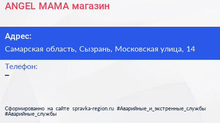 ANGEL MAMA, магазин по адресу Самарская область, Сызрань, Московская улица, 14 в дальнейшем Организация, размещена в следующих категориях: