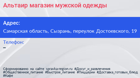 Альтаир, магазин мужской одежды по адресу Самарская область, Сызрань, переулок Достоевского, 19 в дальнейшем Организация, размещена в следующих категориях: