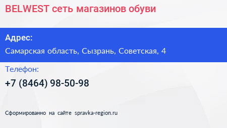 BELWEST, сеть магазинов обуви по адресу Самарская область, Сызрань, Советская, 4 в дальнейшем Организация, размещена в следующих категориях: