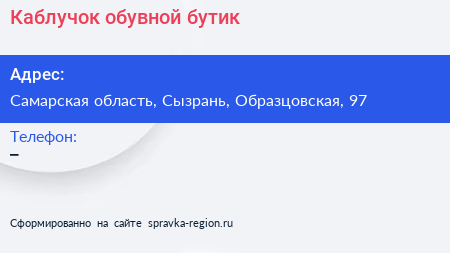 Каблучок, обувной бутик по адресу Самарская область, Сызрань, Образцовская, 97 в дальнейшем Организация, размещена в следующих категориях: