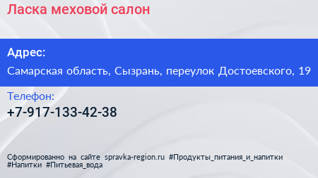 Ласка, меховой салон по адресу Самарская область, Сызрань, переулок Достоевского, 19 в дальнейшем Организация, размещена в следующих категориях: