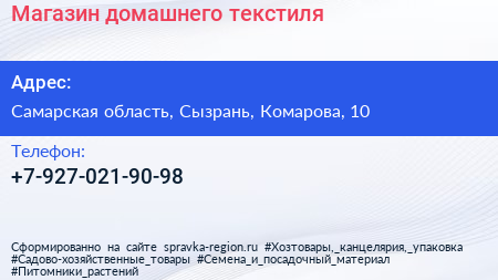 Магазин домашнего текстиля по адресу Самарская область, Сызрань, Комарова, 10 в дальнейшем Организация, размещена в следующих категориях: