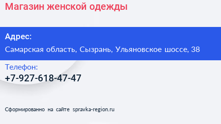 Магазин женской одежды по адресу Самарская область, Сызрань, Ульяновское шоссе, 38 в дальнейшем Организация, размещена в следующих категориях: