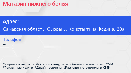 Магазин нижнего белья по адресу Самарская область, Сызрань, Константина Федина, 28а в дальнейшем Организация, размещена в следующих категориях: