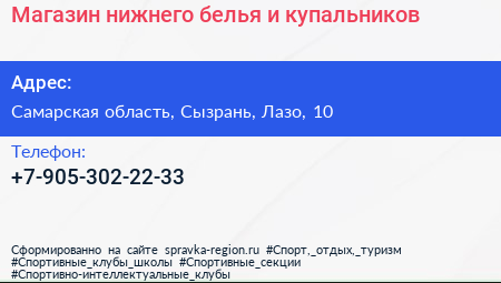 Магазин нижнего белья и купальников по адресу Самарская область, Сызрань, Лазо, 10 в дальнейшем Организация, размещена в следующих категориях: